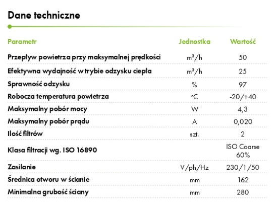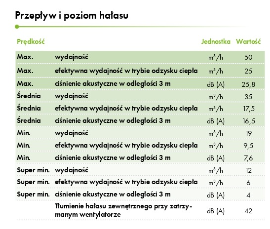 Bogate wyposażenie bez dopłat - pilot, czujnik zmierzchu, czujnik wilgotności, automatyczna przepustnica przeciwwiatrowa, izolacja akustyczna.