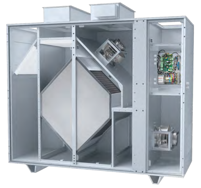 Centrala wentylacyjna z odzyskiem ciepła to nowoczesne urządzenie wentylacyjne zapewniające mechaniczną wymianę powietrza w pomieszczeniach z jednoczesnym jego filtrowaniem. Konstrukcja wymiennika płytowego umożliwia pozyskanie energii cieplnej z powietrza wywiewnego do ogrzania powietrza nawiewanego z zewnątrz. Centrale są przeznaczone do energooszczędnej wentylacji obiektów oraz montażu z przewodami wentylacyjnym o przekroju 600x300 oraz 1000x400 mm.