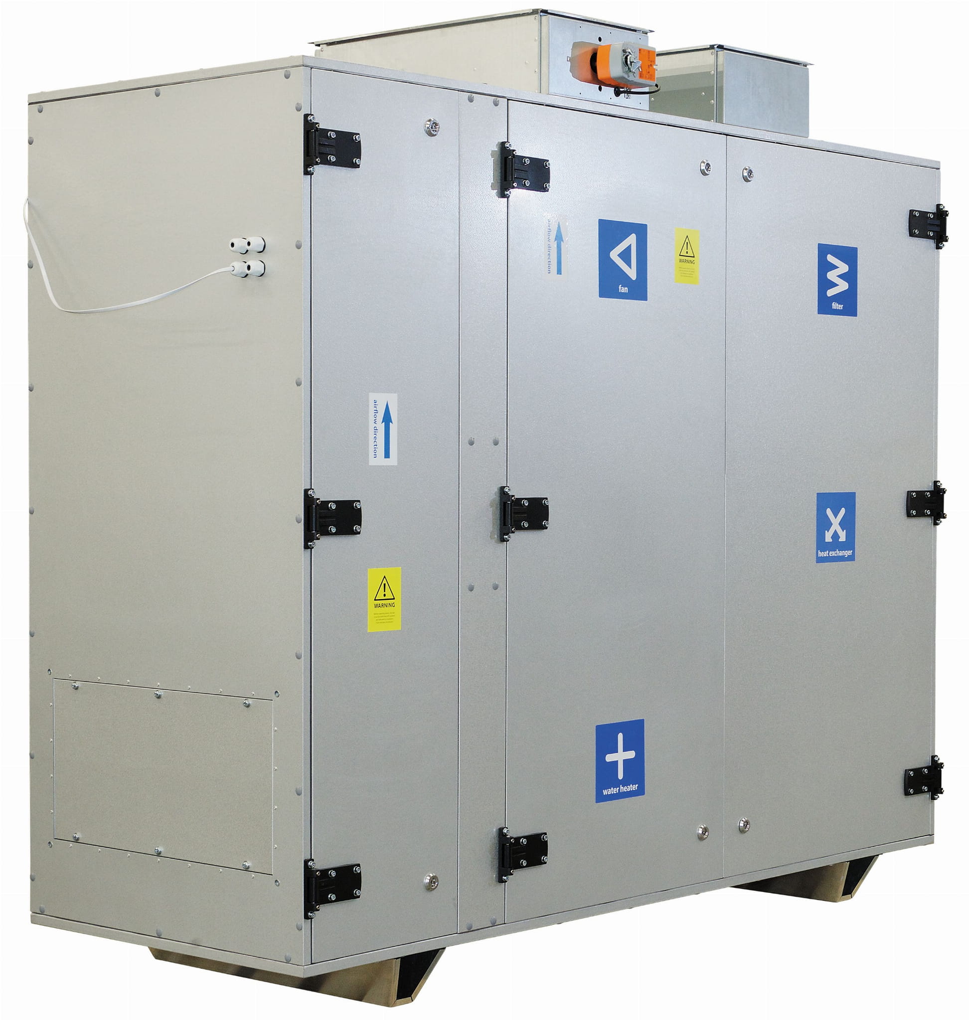 Obudowa jest wykonana ze stali alucynkowej z wewnętrzną izolacją termiczną oraz akustyczną z wełny mineralnej o grubości 40 mm.