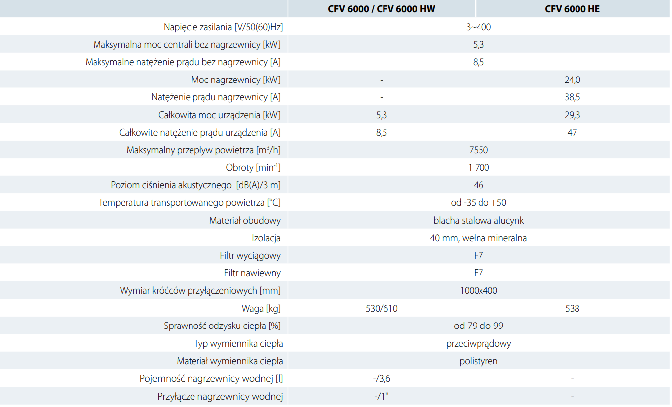 CFV HE modele są wyposażone w nagrzewnicę elektryczną wtórną.
