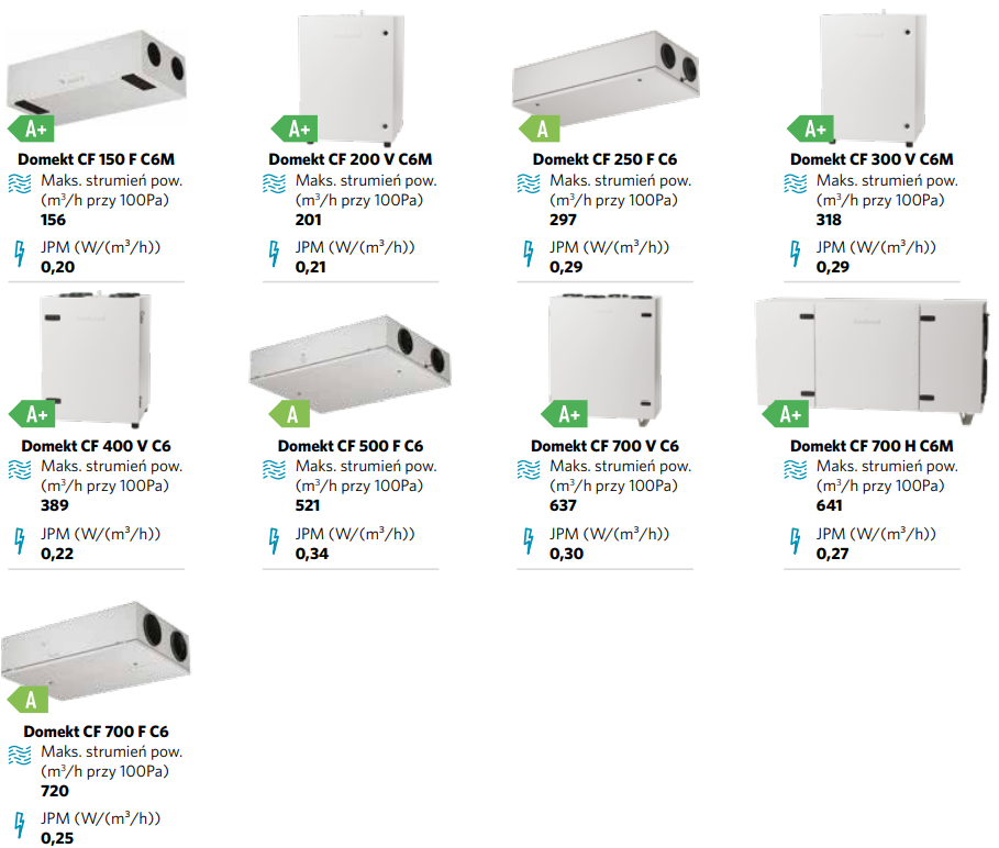 Poniżej przedstawione centrale wentylacyjne z odzyskiem ciepła serii Domekt, spełniają wymogi określone w Rozporządzeniu Delegowanym Komisji (UE) nr 1254/2014 z dnia 11 lipca 2014 r. oraz w Rozporządzeniu Parlamentu Europejskiego i Rady (UE) 2017/1369 z dnia 4 lipca 2017 r. ustanawiającym ramy etykietowania energetycznego i posiadają klasę efektywności energetycznej minimum A na podstawie karty produktu i etykiety energetycznej.