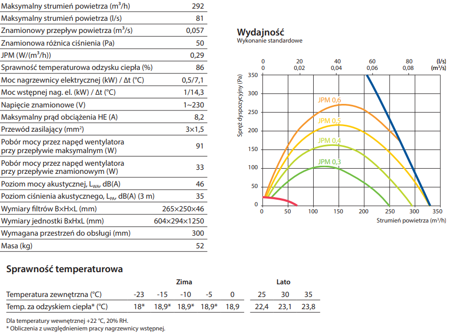 Maksymalny strumień powietrza - 292 m3/h, sprawność temperaturowa odzysku ciepła - 86%.