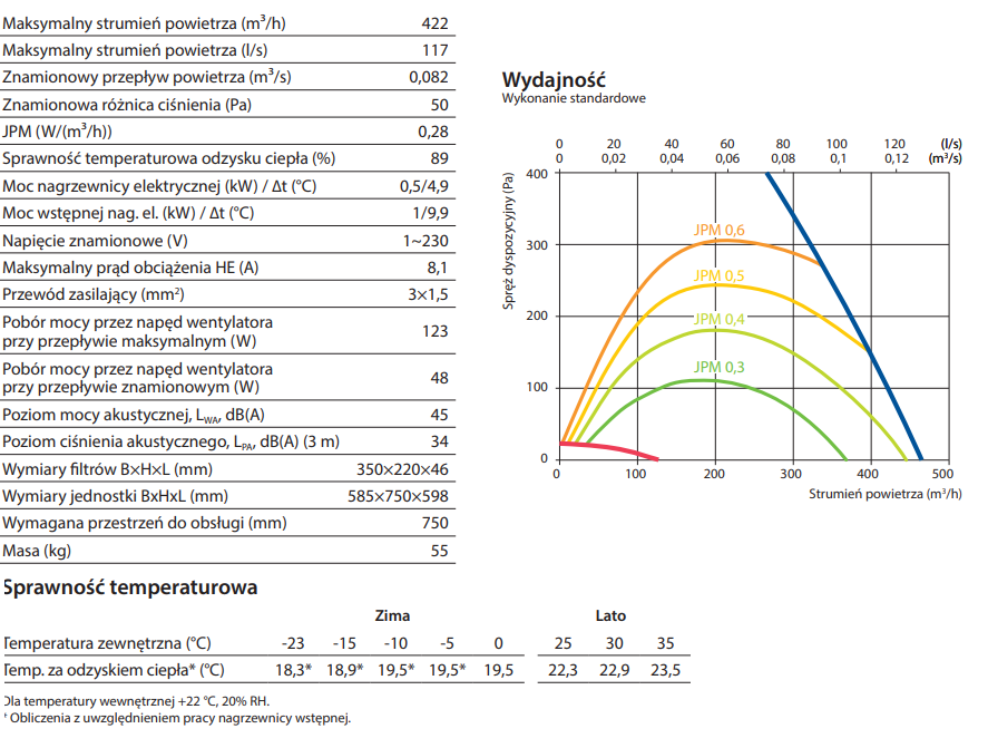 Maksymalny strumień powietrza - 422 m3/h, sprawność temperaturowa odzysku ciepła - 89%.