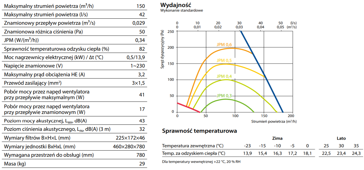 JPM - 0,34 (W/m3/h), pobór mocy przez napęd wentylatora przy przepływie maksymalnym - 41 W.