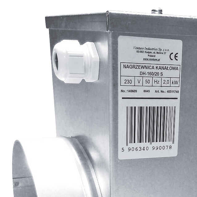 Elektryczne nagrzewnice kanałowe przystosowane do montażu bezpośrednio w okrągłych kanałach wentylacyjnych o standardowych średnicach (100-400 mm). Obudowa nagrzewnic wykonana jest z ocynkowanej blachy stalowej, a elementy grzewcze ze stali nierdzewnej. Nagrzewnice posiadają standardowo montowany podwójny układ zabezpieczenia przed przegrzaniem: pierwszy element automatyczny (temp. +75°C), drugi z odblokowaniem ręcznym (temp. +85°C). Nagrzewnice kanałowe powinny być dobierane tak, aby temperatura powietrza wylotowego nie przekraczała +40°C. Prędkość przepływu powietrza przez nagrzewnice nie może być mniejsza niz 1,5 m/s.
