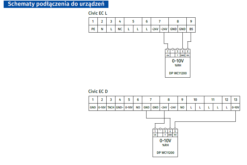 - Czujnik posiada dwa wyjścia analogowe: 0-10 V i 4-20 mA. Wyjście analogowe umożliwia płynną regulację prędkości obrotowej wentylatora (wymagane zastosowanie wentylatorów z silnikiem EC).