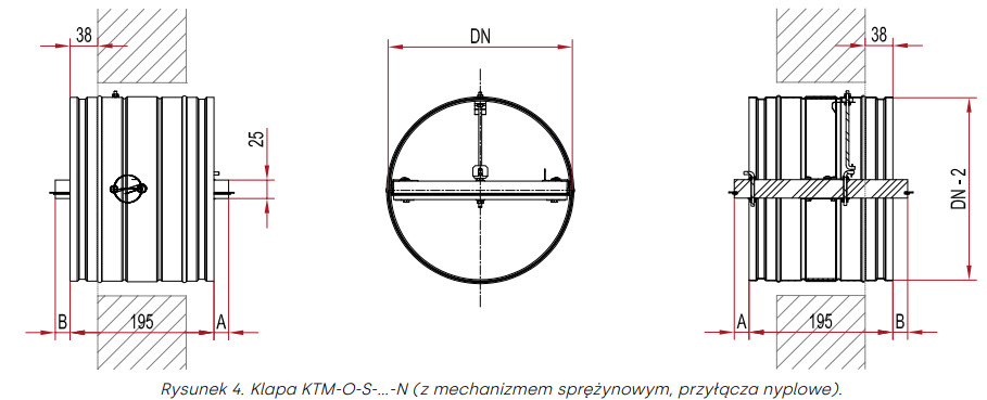 Klapy KTM-O-S (z mechanizmem sprężynowym) składają się z obudowy o przekroju kołowym, ruchomej jednopłaszczyznowej przegrody odcinającej i mechanizmu napędowego z elementem wyzwalającym.