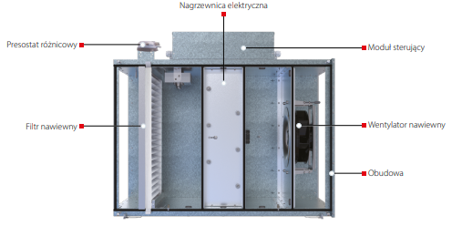 Nagrzewnica elektryczna zapewnia podgrzewanie powietrza nawiewanego w okresie zimowym.