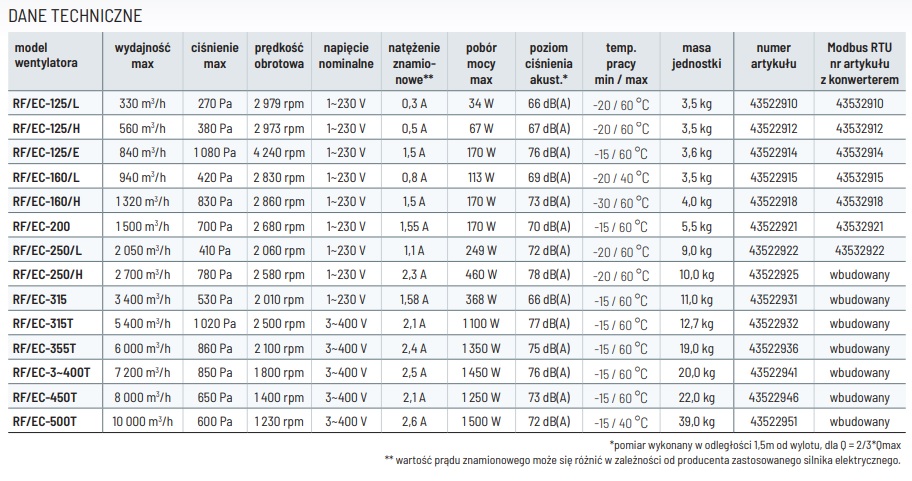 W wentylatorach RF/EC (355-500) stosowane są wirniki z łopatkami pochylonymi do tyłu, z tworzywa sztucznego. Obudowa wykonana z blachy alucynkowej, czasza/pokrywa wykonana z aluminium (model 355) lub z laminatu (modele 400, 450 i 500).