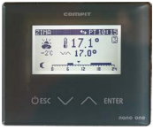 NANO ONE termostatem pokojowym współpracującym z regulatorami COMPIT. Można na nim ustawić temperaturę zadaną komfortową, eko, temperaturę w programie POZA DOMEM (URLOP). Przełączanie pomiędzy temperaturą komfortową a eko jest realizowane automatycznie za pomocą zaprogramowanego harmonogramu dziennego i tygodniowego. Dodatkowo termostat posiada harmonogram na dni świąteczne oraz tryb pracy ręcznej.