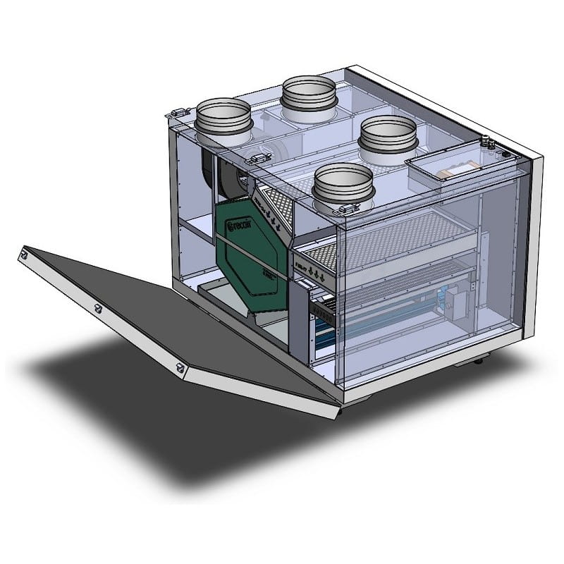 - WENTYLATORY – zastosowane zostały silniki elektro-komutatorowe prądu stałego (EC). Silniki EC zapewniają wysoką wydajność i regulację w pełnym zakresie prędkości obrotowej wentylatora