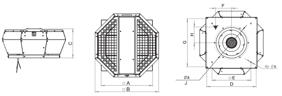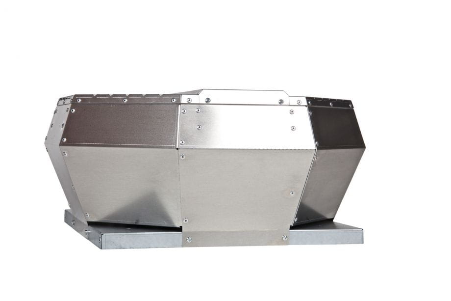 Dachowy wentylator promieniowy z wyrzutem pionowym z silnikiem umieszczonym w strumieniu przepływającego powietrza. Obudowa (boczna i górna) została wykonana z wysokiej jakości niekorodującego stopu aluminium odpornego na działanie czynników atmosferycznych (AlMg3) i składa się z nisko profilowanej osłony w kształcie ośmiokąta z siatką. Całość została umieszczona na kwadratowej płycie montażowej wykonanej z galwanizowanej blachy stalowej. Konstrukcja wentylatora umożliwia montaż na podstawie dachowej lub cokole murowanym o przekroju kwadratowym. Wokół profilowanego wlotu do wirnika umieszczone zostały króćce gwintowane umożliwiajace montaż akcesoriów dachowych takich jak: króćce, klapy zwrotne czy złącza przeciwdragniowe.