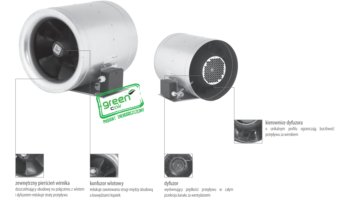 Diagonalny wentylator kanałowy. Obudowa wykonana z blachy stalowej cynkowanej galwanicznie, dla średnicy 200 z tworzywa w kolorze czarnym, a od średnicy 400 włącznie - w całości z aluminium. Unikalny konfuzor wlotowy dostosowany dokładnie do wymiarów wirnika sprawia, że powietrze jest zaciągane bezpośrednio na stożek wirnika diagonalnego bez zawirowań strugi między obudową a krawędziami łopatek. Przed utratą sprawności na krawędziach łopatek chroni również specjalny profilowany pierścień łączący wszystkie łopatki i doszczelniający komorę przepływu pomiędzy konfuzorem a kierownicami dyfuzora znajdującego się za wirnikiem. Silnik został obudowany profilem dyfuzora wykonanym z tworzywa sztucznego, którego głównymi elementami są profilowane kierownice mające za zadanie maksymalne ograniczenie burzliwości przepływu za wirnikiem oraz ścięty stożek wyrównujący prędkości przepływu w całym przekroju kanału za wentylatorem. Takie połączenie różnego rodzaju elementów regulacji strumienia powietrza sprawia, że efektywność pracy wentylatora wzrosła o około 50% w stosunku do standardowych wentylatorów z wirnikami promieniowymi.