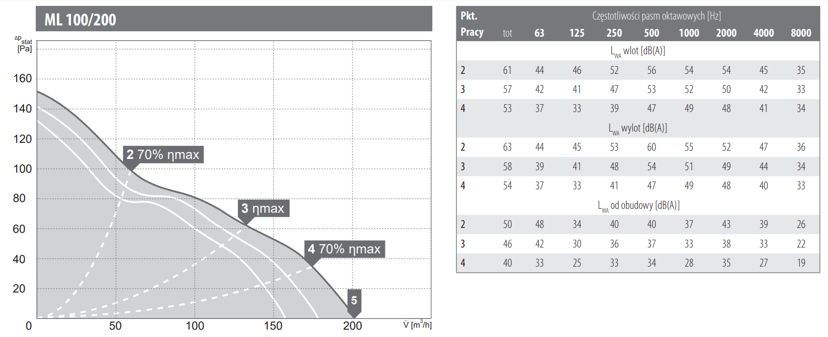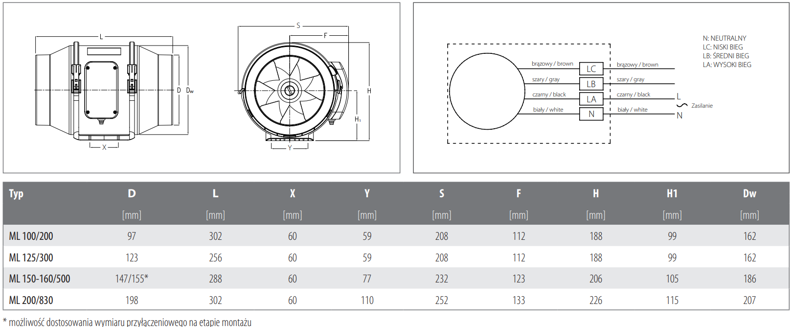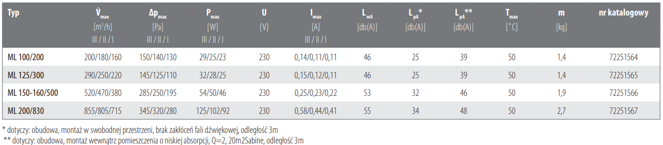 Wentylatory ML posiadają trzybiegowy asynchroniczny silnik elektryczny 1~230V, 50Hz, wyposażony w łożyska kulkowe oraz zintegrowane zabezpieczenie termiczne. Wentylatory występują w dwóch seriach różniących się od siebie sposobem regulacji obrotów. W pierwszej serii, regulacji należy dokonać podczas montażu i podłączenia, za pomocą zworki należy zdefiniować na stałe jedną z trzech prędkości obrotowych wentylatora. Możliwa również w tej serii jest regulacja silnika poprzez obniżenie napięcia zasilającego w zakresie od 120-230V. Uwaga! W tym celu należy skonfigurować wentylator do pracy na najwyższym biegu. Dodatkowo modele 100 i 160 dostępne są w wersji z regulowanym opóźnieniem czasowym wyłączenia w zakresie 3-25 minut.