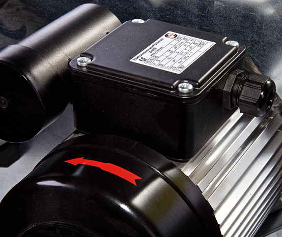 Jednofazowy (230V, 50Hz, IP54, klasa izolacji F) lub trójfazowy (400V, 50Hz, IP55, klasa izolacji F) asynchroniczny silnik elektryczny zlokalizowany całkowicie poza strumieniem usuwanego powietrza. Prędkość obrotowa modeli jednofazowych może być kontrolowana przy pomocy regulatorów transformatorowych. Zalecany zakres regulacji napięcia 110-230V. Silniki te posiadają czujniki temperatury uzwojeń typu termokontakt, które muszą być podłączone i monitorowane przez zewnętrzne urządzenie ochrony termicznej, np. automatykę, przekaźnik wbudowany w regulator, przekaźnik SET10 itp. Prędkość obrotowa modeli z silnikami trójfazowymi (3x230Δ/3x400Y) może być kontrolowana za pomocą przemienników częstotliwości, wyłącznie w zakresie częstotliwości (obrotów) podanych w tabeli/wykresie doboru. Zalecany czas przyspieszania i hamowania przetwornicą (rampa): 20-30 sek. W przypadku bezpośredniego podłączania silników trójfazowych do sieci należy je zabezpieczyć przy pomocy wyłączników silnikowych z wbudowanym wyzwalaczem zwarciowym i przeciążeniowym. Nastawa wyzwalacza termicznego wyłącznika silnikowego musi być dostosowana do rzeczywistych parametrów pracy wentylatora i nie wyższa niż wartość Imax dla wentylatora.