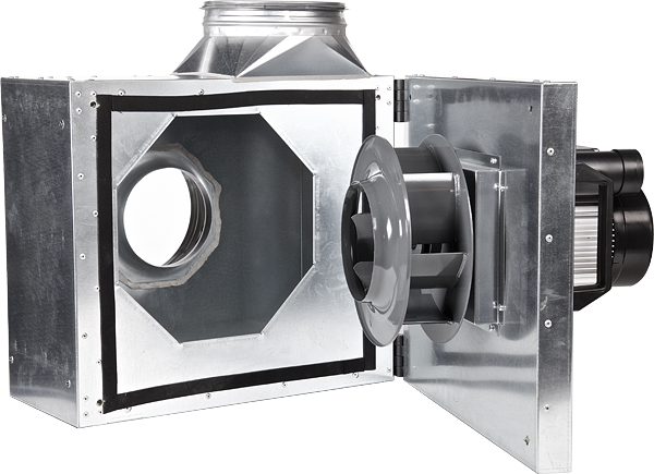 Wentylator promieniowy przeznaczony głównie do stosowania w wyciągach kuchennych. Obudowa wykonana z galwanizowanej blachy stalowej, izolowana termicznie i akustycznie wełną mineralną o grubości 40 mm, posiada łatwo otwierane drzwi inspekcyjne, na których zamontowany jest układ silnik-wirnik, co pozwala na łatwe czyszczenie wnętrza wentylatora. Elastyczne uszczelki i odpowiednia konstrukcja pozwalają osiągnąć najwyższą klasę szczelności obudowy L1 (wg. EN 1886). Obudowa została zaprojektowana tak, aby ułatwić odprowadzanie skroplin z wnętrza wentylatora poprzez odpływ drenażowy 3/4” (pod warunkiem instalacji wentylatora wylotem w górę, ponadto instalacja powinna być wyposażona w stosowne filtry / łapacze tłuszczu). W komplecie dostarczane są gumowe wibroizolatory oraz szyny wspornikowe ułatwiające montaż na konsoli wsporczej.
