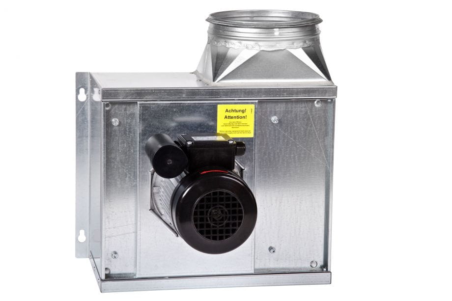 Wentylator promieniowy z silnikiem zlokalizowanym poza strumieniem przetłaczanego powietrza przeznaczony do stosowania w instalacjach wyciągowych kuchennych.