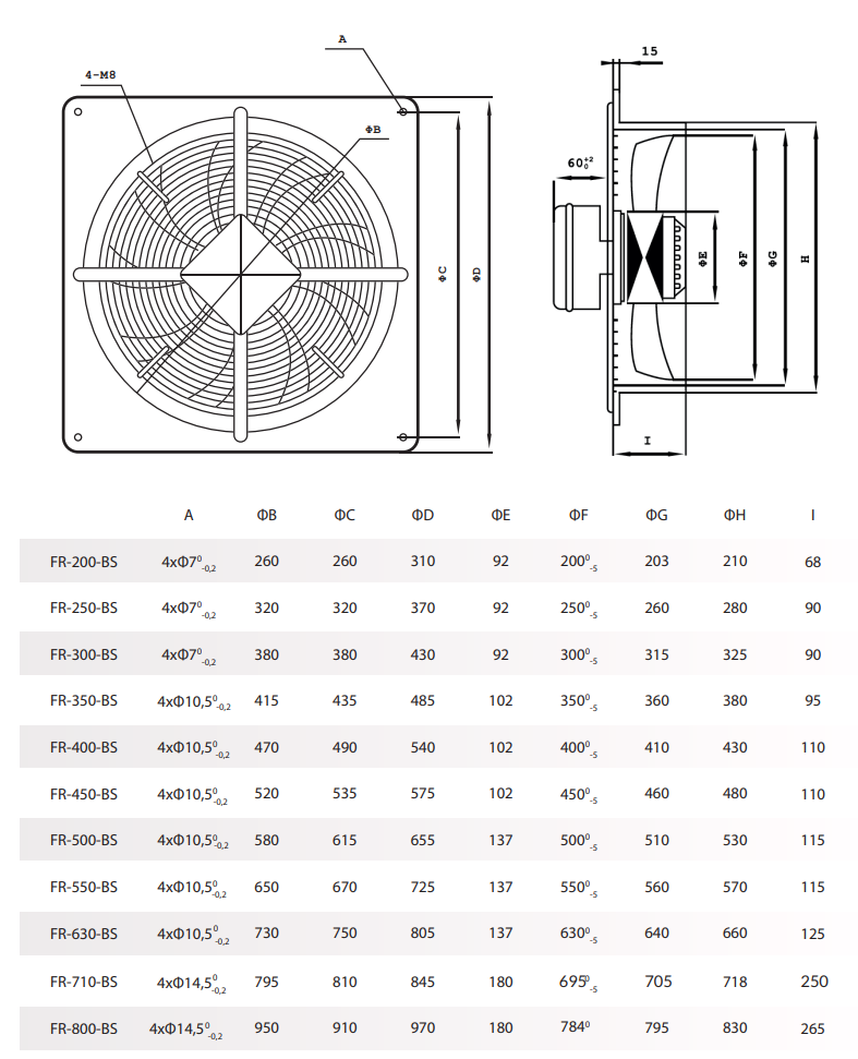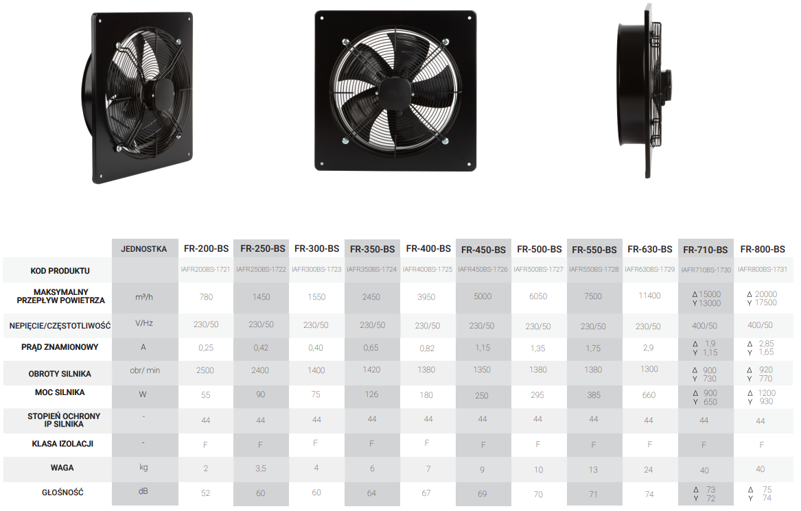 Wentylator osiowy serii FR-BS przeznaczony jest do montażu ściennego. W tym celu wyposażony został w kwadratową ramę z miejscem na śruby montażowe. Urządzenie wykonane zostało ze stali malowanej proszkowo z dbałością o każdy szczegół. Odpowiednio wyprofilowane łopatki, zapewniają wysoką wydajność wyciągu wentylatora. Mogą być wykorzystane zarówno w pomieszczeniach komercyjnych jak i przemysłowych. Są również odpowiednie do lokali mieszkalnych.