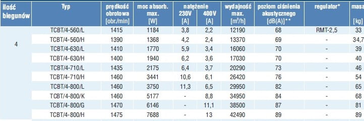 Silnik jednofazowy (modele TCBB) lub trójfazowy (modele TCBT). Modele 250, 315, 355 i 400 - silnik z wirującym stojanem, stopień ochrony IP44, klasa izolacji F, zabezpieczenie termiczne przed przeciążeniem, temperatura pracy w zakresie -40 C do +40 C. Modele 450, 500, 560, 630 i 6/710 - stopień ochrony IP65, klasa izolacji F, zabezpieczenie termiczne przed przeciążeniem, temperatura pracy w zakresie -40 C do +70 C. Modele 4/710 i 800 - stopień ochrony IP55, klasa izolacji F, temperatura pracy -40 C do +40 C. Wszystkie silniki trójfazowe są przystosowane do regulacji za pomocą falownika w zakresie 25-50 Hz.